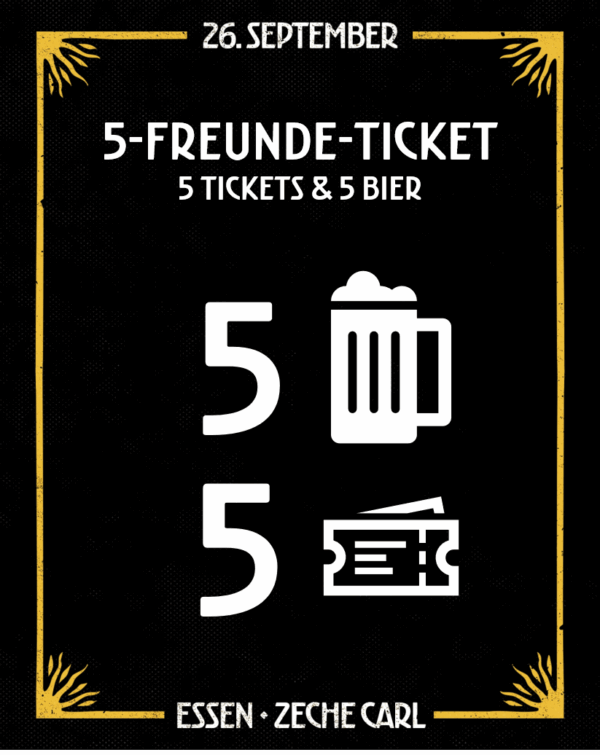 Mit dem 5-Freundes-Ticket, bekommst du 5 Tickets für das Formosa Bierfest'26 per Mail zugeschickt. Am 26.09.26 dem Formosa Bierfest'26 bekommst du dann 5 Wertmarken am Merchandisingstand von Formosa mit denen du dann deine 5 Bier (0,4 Liter) erhältst. Das 5 Freunde Ticket ist streng limitiert!